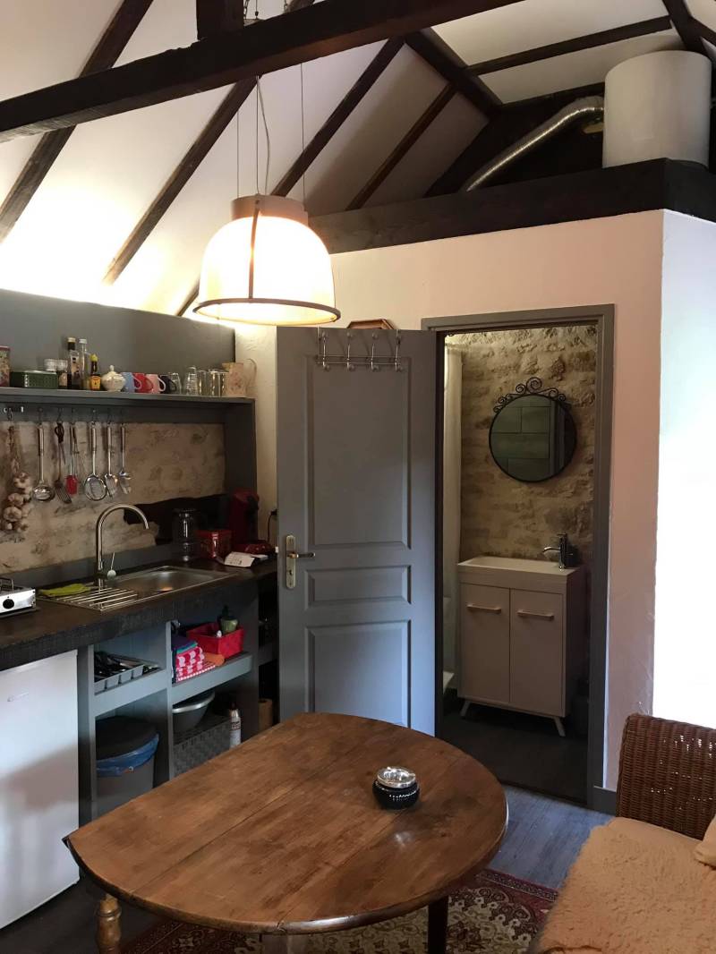 De schuur op ons erf werd door ons onder handen genomen en omgetoverd tot een kleine gîte met alle voorzieningen (incl. zonnepanelen) voor een onbezorgde vakantie. De open ruimte bestaat uit een keuken, zithoek, een goed 2-persoons bed en een aparte badkamer. De oude elementen van de schuur hebben we zo goed mogelijk bewaard.
